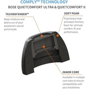 Engineered specifically for your Bose QuietComfort II and Bose QuietComfort Ultra earbuds, Comply ear tips are tailored to help you achieve maximum audio quality without worrying about repositioning and noise hindrances. Empower your listening experience with the renowned audio quality of the Bose brand with a confidence boost in wearing your earbuds.